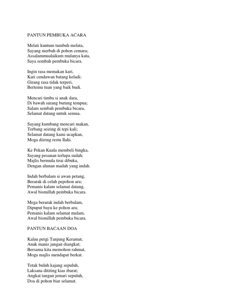 . Ane punya pantun nih Mpo Nori sukanye daun sirih Mpo Juve sukanye daun salam Yuk kawan-kawan mari Sama-sama kite menjawab salam Assalaamualaikum Warohmatullahi Wabarokaatuh Alhamdulillah Alhamdulillahirobbil alamiin Wassholaatu Wassalaamu alaa Sayyidina Muhammadin Wa ala aalihi Washohbihi ajmaiin. PANTUN MAJLIS PANTUN PEMBUKA ACARA Melati kuntum tumbuh melata Sayang merbah di pohon cemara. Jamuan 1230 tengah hari.